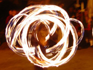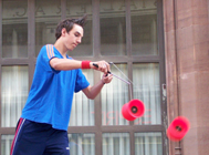 In wilden „loopings“ schleudern Jonglierutensilien durch die Luft. Keulen, Diabolos und Bälle fliegen...